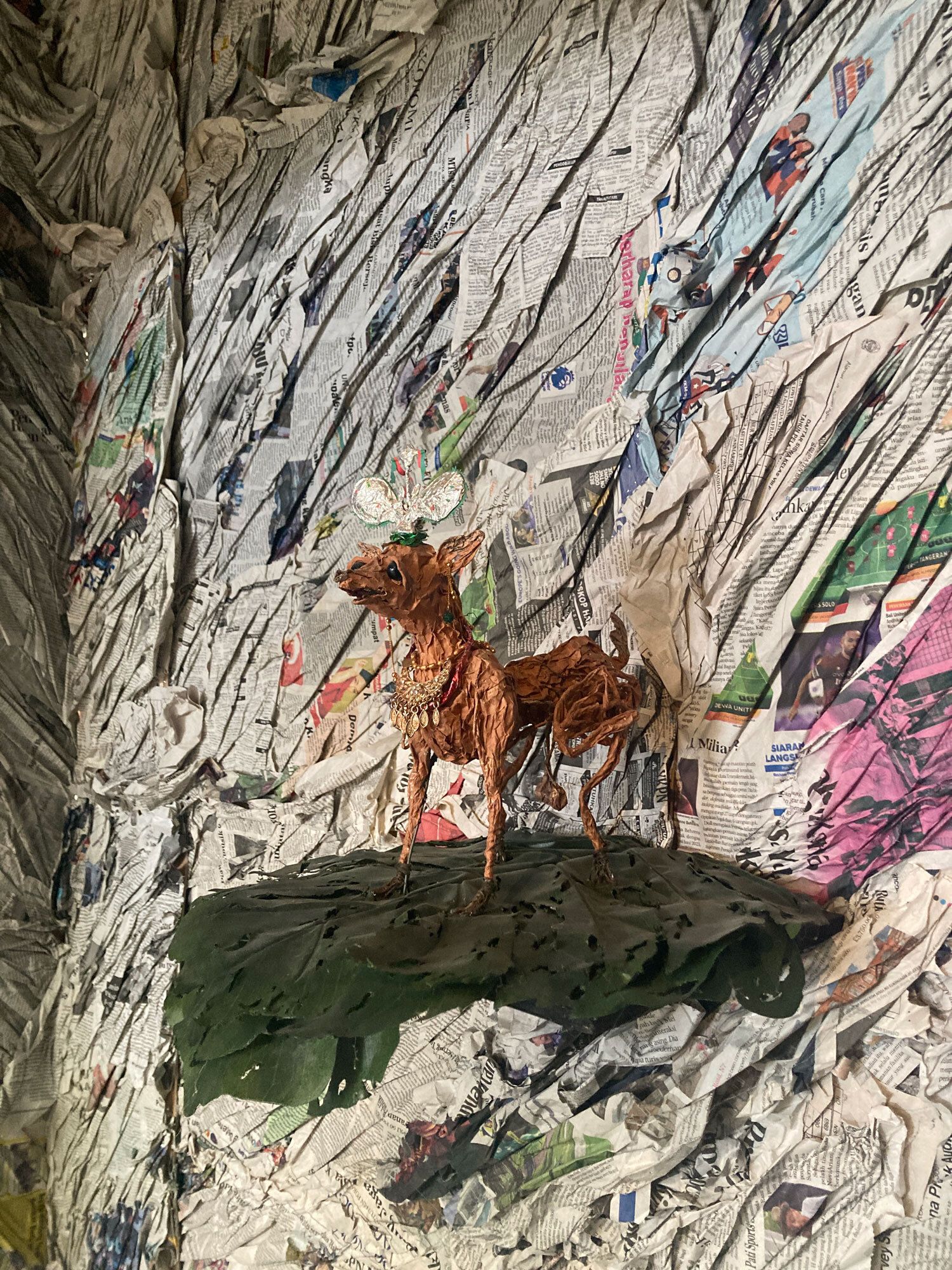 Within the same space, a stop-motion film by Taiwanese artist ZHANG Xu Zhan runs in an area fully plastered with crushed newspaper. Coming from a family with a tradition in paper puppet making, Xu Zhan created this puppet of the Kanchil (Mousedeer) during his residency in Yogyakarta, then spent about 5 years to put together the film with his team. Compound Eyes of Tropical shows the various dramatic interpretations of the local folklore of the Mousedeer crossing the river through the lens of a housefly.